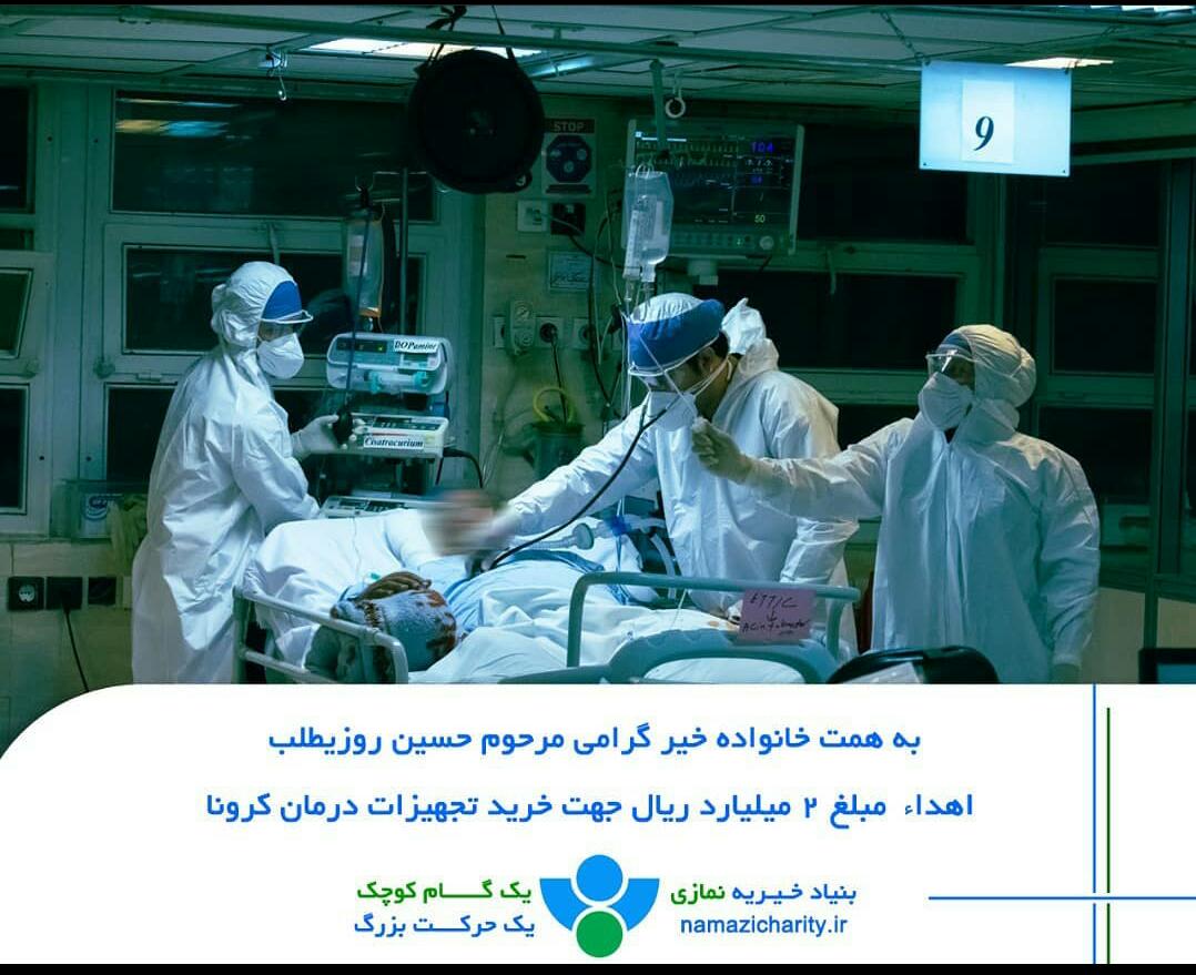 به همت خانواده محترم خیّر گرامی مرحوم حسین روزی طلب در شهریور ماه سال 1400 مبلغ دو میلیارد ریال جهت خرید تجهیزات درمان کرونا به بنیاد خیریه نمازی اهدا گردید...